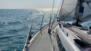 The standard cruising sails, supplied and meticulously maintained by OneSails, remain in excellent condition thanks to regular servicing and professional laundering.